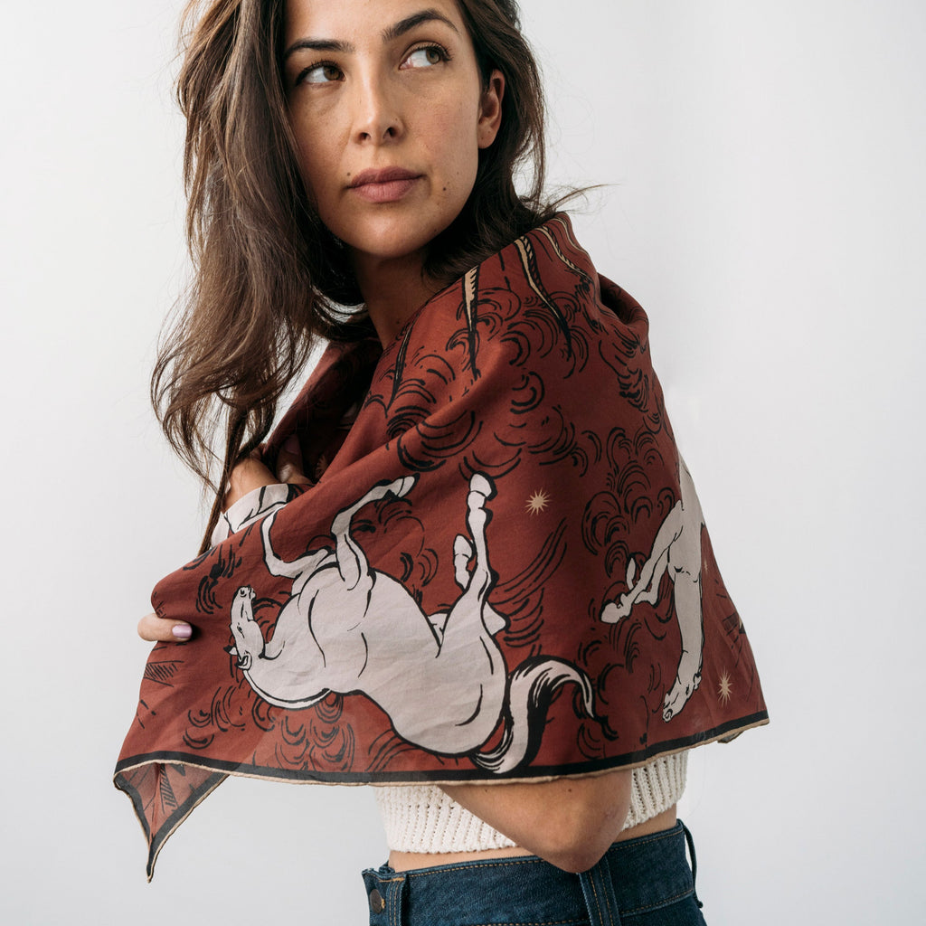 The Celestial collection is a wonderful collaboration between a few artists who we admire. Michael Bergt, a local Santa Fe artist, drew the lovely playful horses, Danielle Demers sketched the sun and stars, and our founder put the pieces together to create the complete design on our silk scarves. The collection was inspired by the beautiful designs on old church ceilings in Italy. We loved the idea of creating a piece celebrating horses playing in the “heavens.”